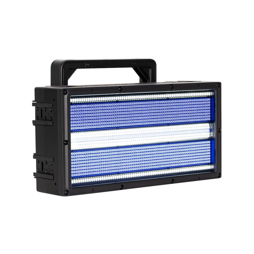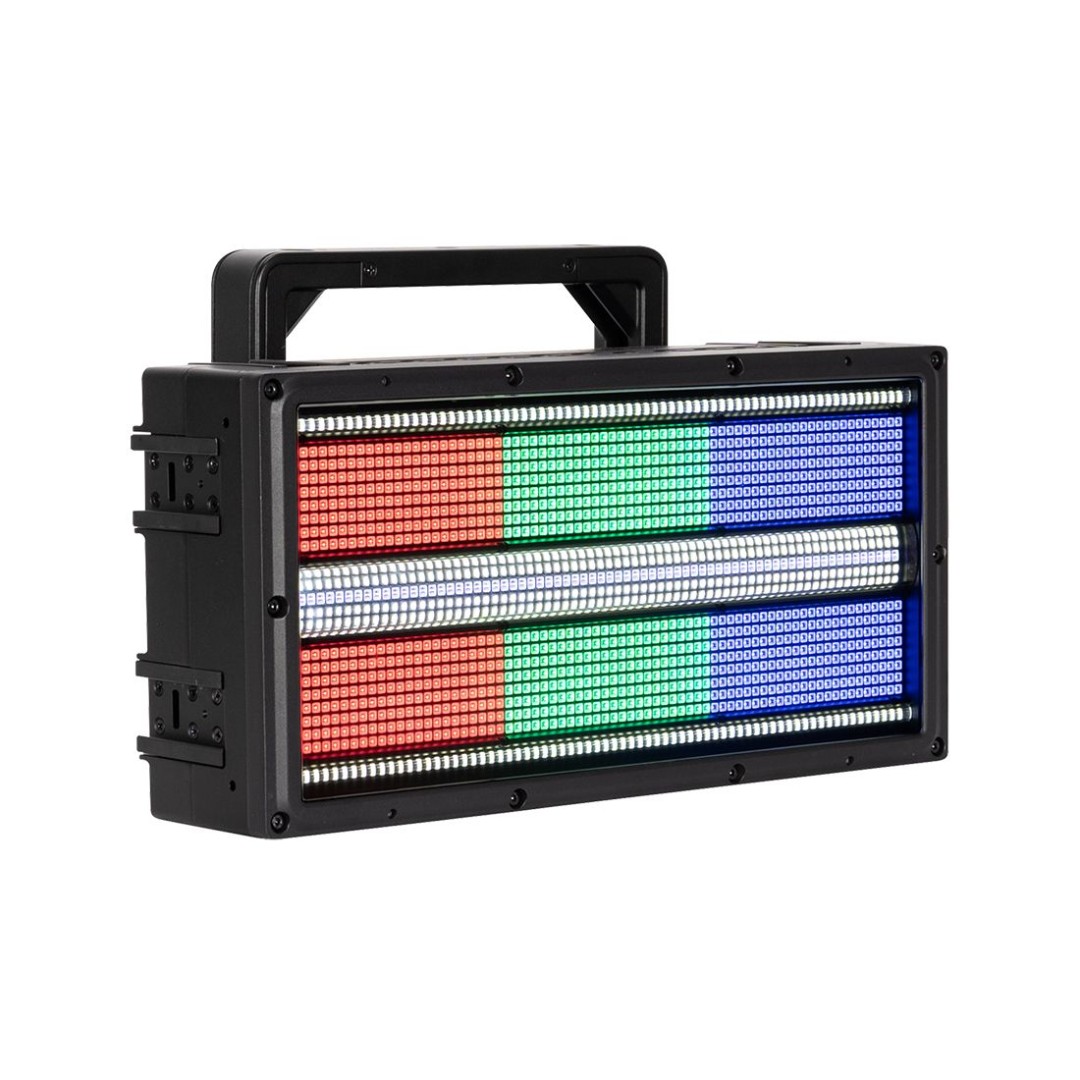 The PULSE PANEL features the same LED layout found on the Pulse Panel FX. 1,152 1.5W RGB LEDs spread across 24 zones around its perimeter, arranged in a grid of 6 zones wide and 4 zones tall. In addition to this, it includes a central strobe line comprising 288 5W cool-white LEDs organized into 24 zones, with 12 zones across and 2 zones tall. These are separated by a line of 96 1.5W RGB LEDs divided into 12 zones. Furthermore, there are 144 additional 5W cool-white LEDs divided into 24 zones, with 12 zones at the top and 12 at the bottom of the fixture's face. These outer LEDs utilize a linear prismatic lens similar to those used in our Rayzor Blade fixtures. When combined, these components deliver an astonishing output exceeding 100,000 total lumens.